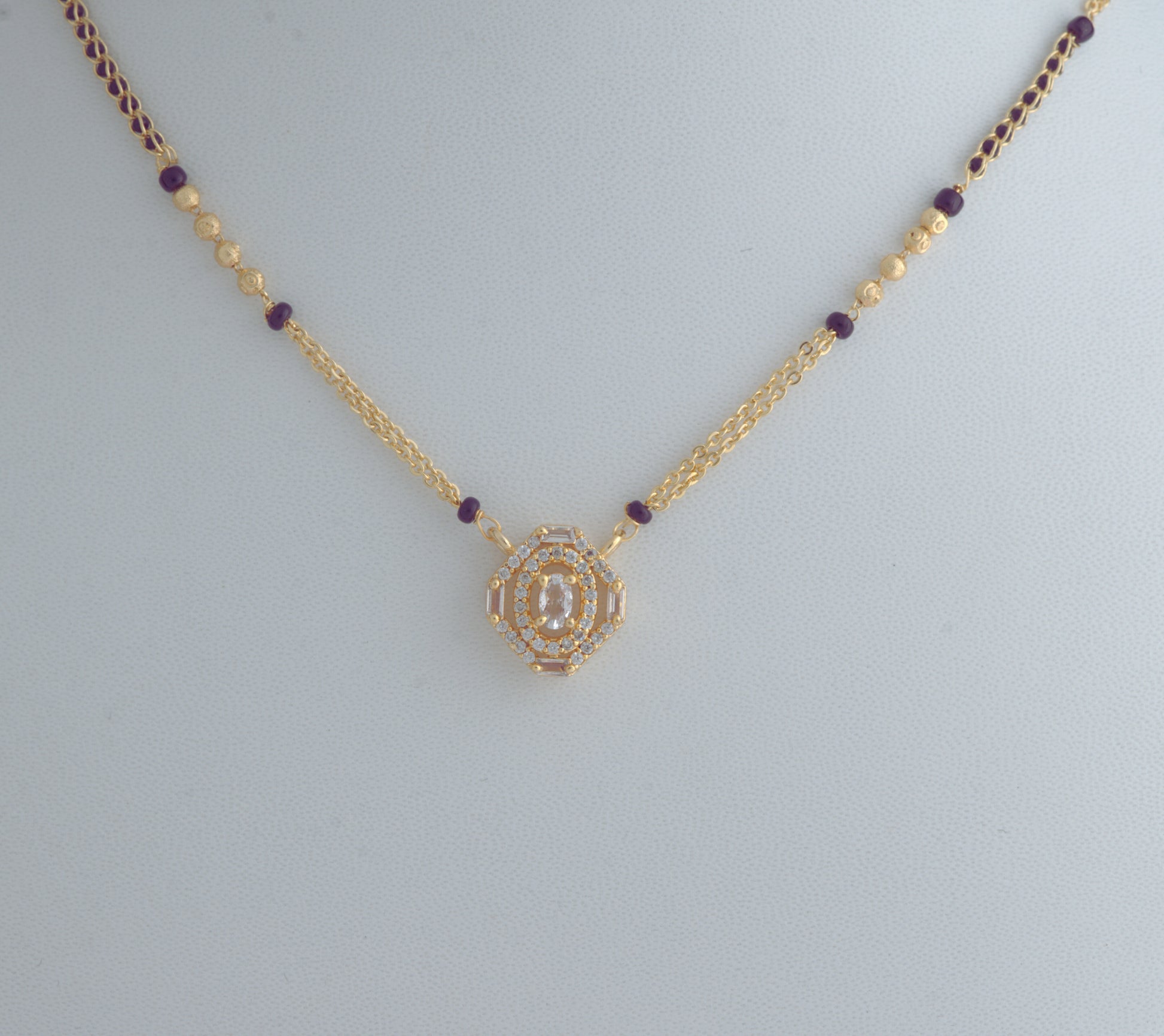 The Amara Mangalsutra features single strands of traditional black glass beads (kali moti) paired with a polished yellow gold pendant and earrings. Accented with sparkling cubic zirconia or diamonds, the white stone-studded design offers a refined blend of modern elegance and cultural heritage.