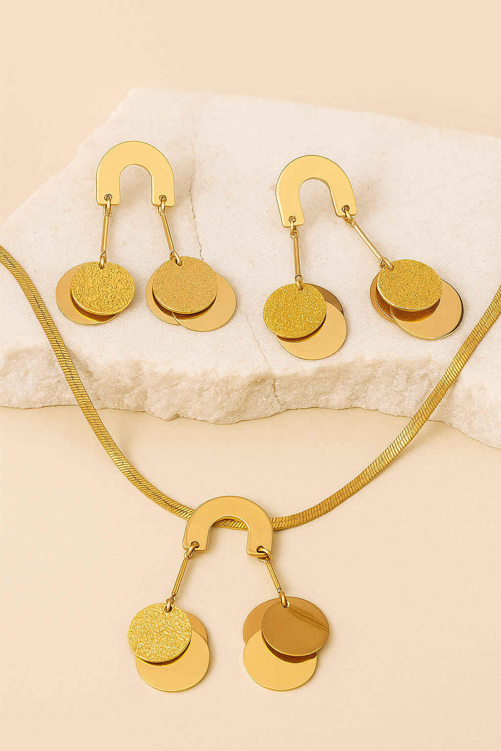 The Marcellia Set features gold-plated stainless steel with anti-tarnish protection, ideal for occasional wear. Backed by a 360-day warranty, it ensures enduring quality and elegance.