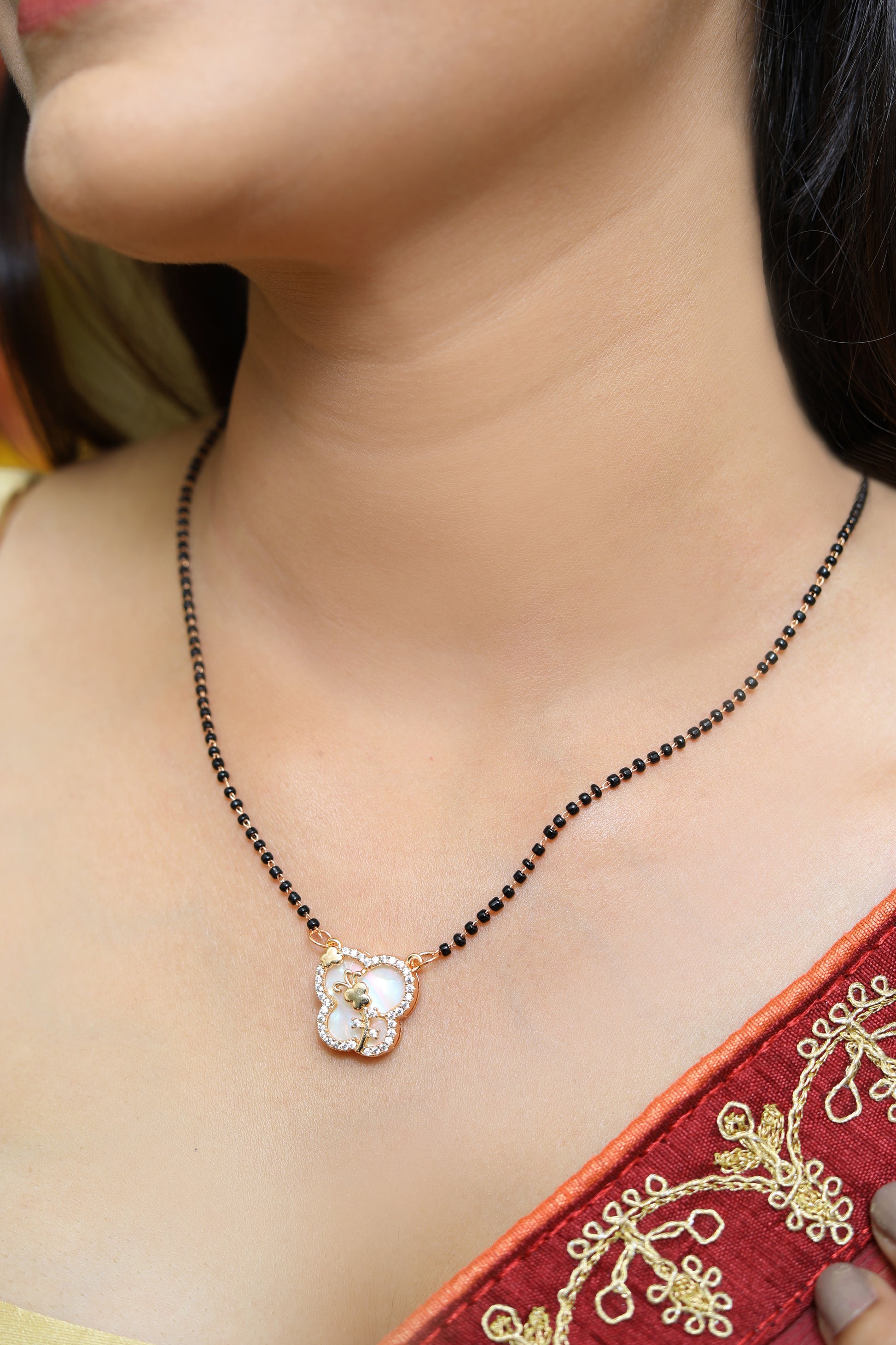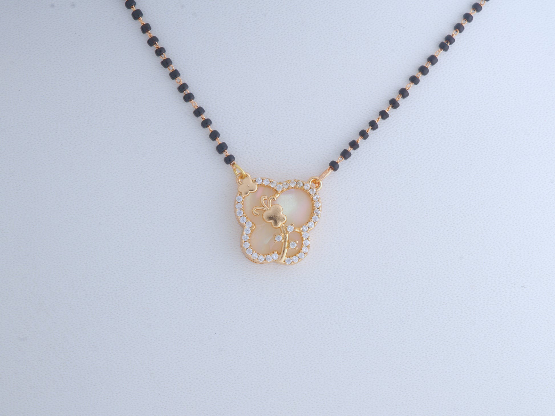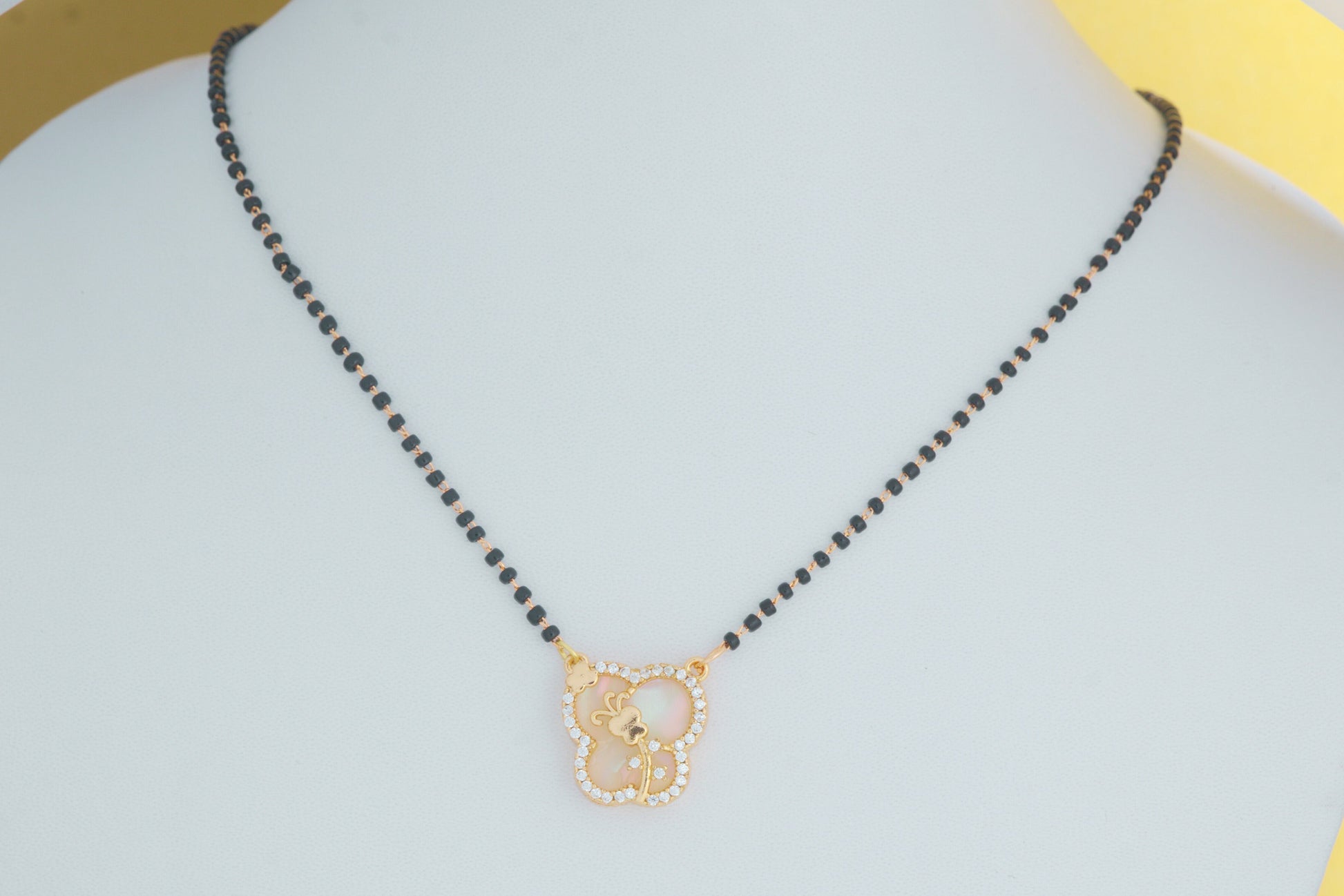 The Pushpika Mangalsutra combines a gold pendant with a clover-shaped floral and butterfly motif, accented by sparkling white stones. Its traditional black bead chain with golden beads preserves cultural heritage while offering a lightweight, modern, and youthful design.