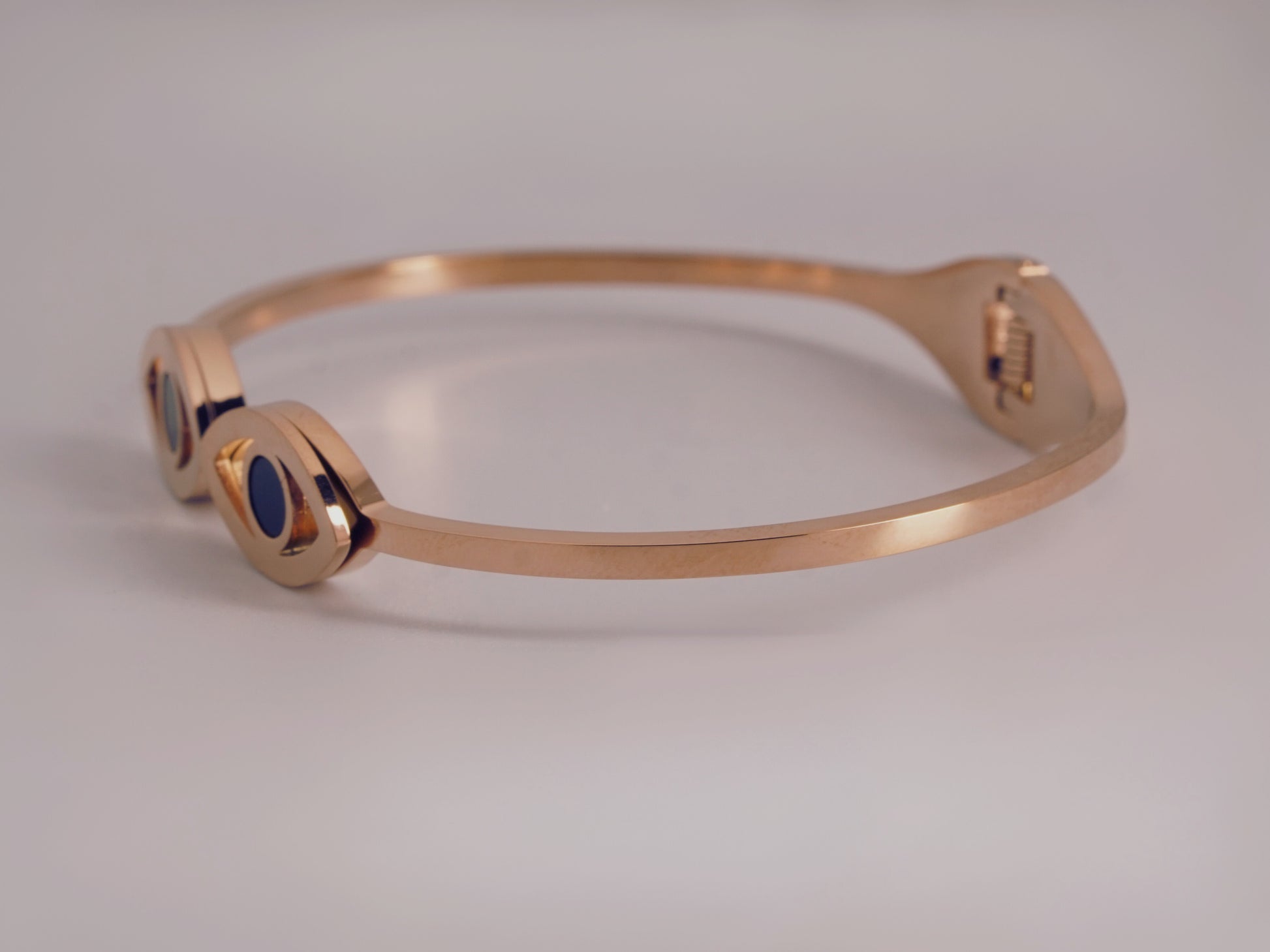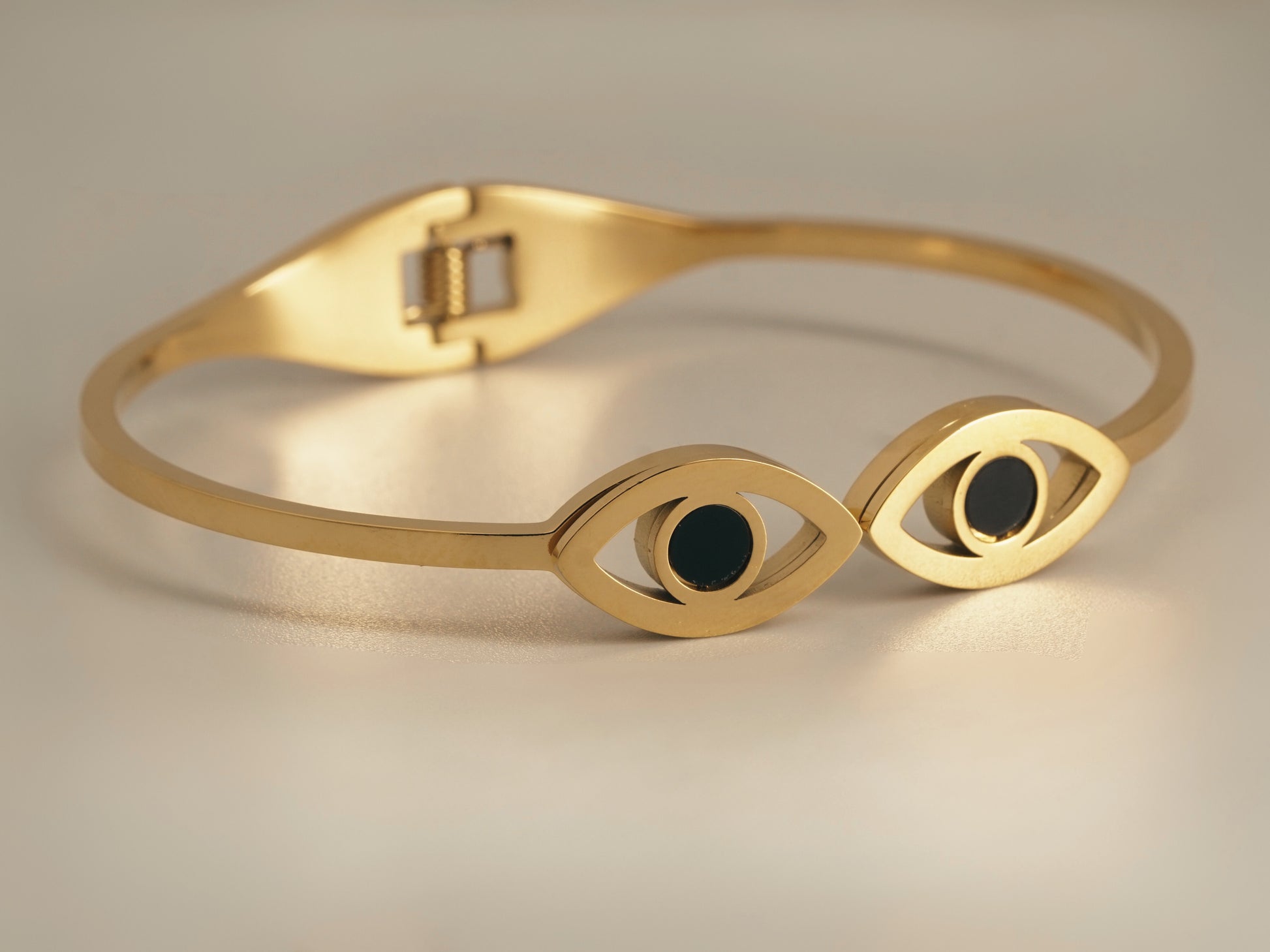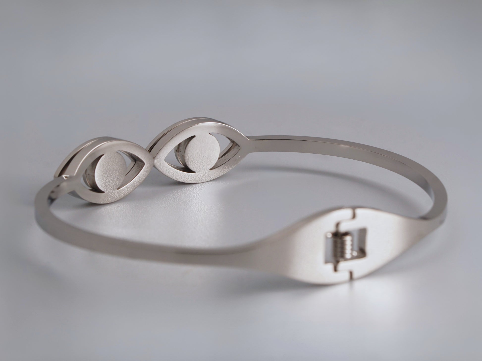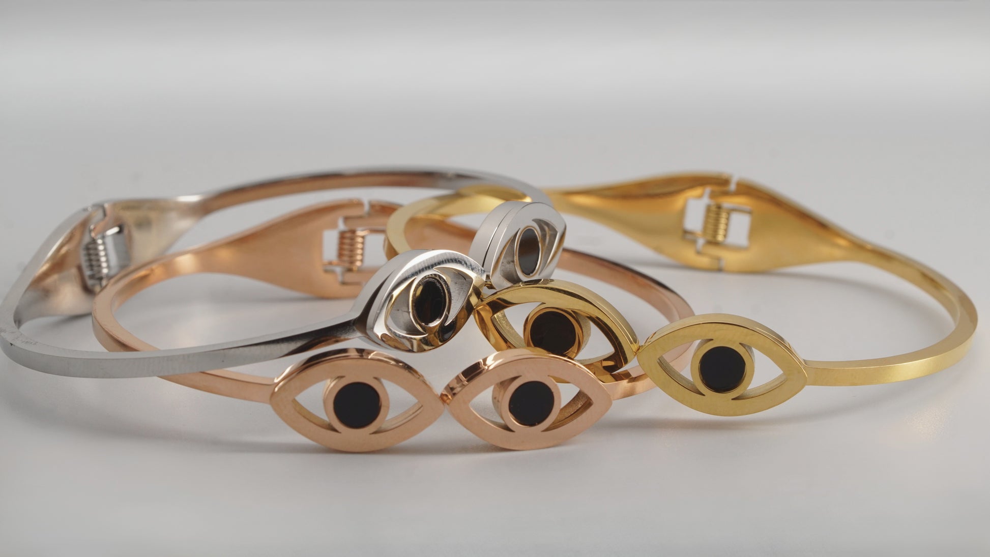 The Caelum Oculus women's kada combines bold eye motifs with a contemporary design, making it a striking fashion statement for both everyday and special occasions. Crafted from stainless steel and expertly plated in rhodium, gold, and rose gold, it offers anti-tarnish durability and a sleek, polished finish. This accessory adds a refined yet youthful edge, elevating any outfit with subtle sophistication.